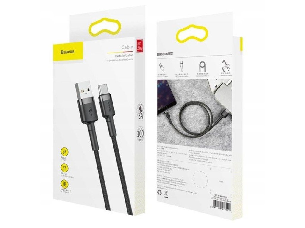Baseus Cafule je vysoce kvalitní kabel USB - USB typu C, určený pro přenos dat a nabíjení zařízení. Díky zesílené konstrukci má zvýšenou odolnost proti přetržení (dodatečná ochrana na kabelu u zástrčky a silnější opletení dostupné pouze ve verzi Cafule).