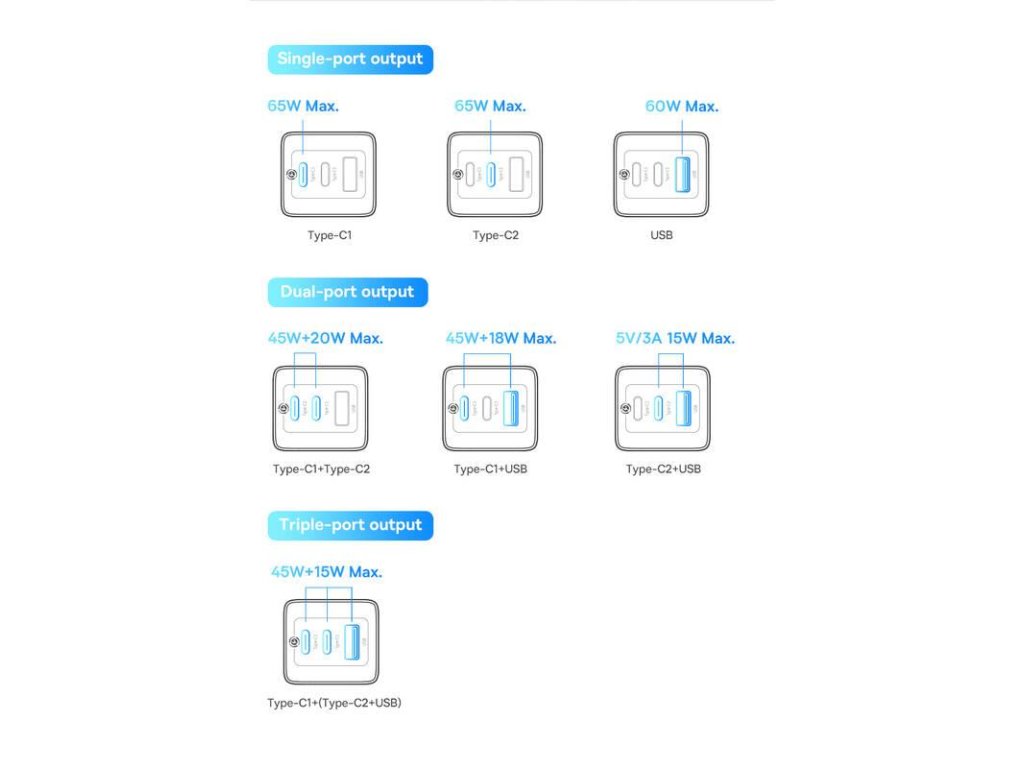 USB-C1 + (USB-C2 + USB-A): 45W + 15W