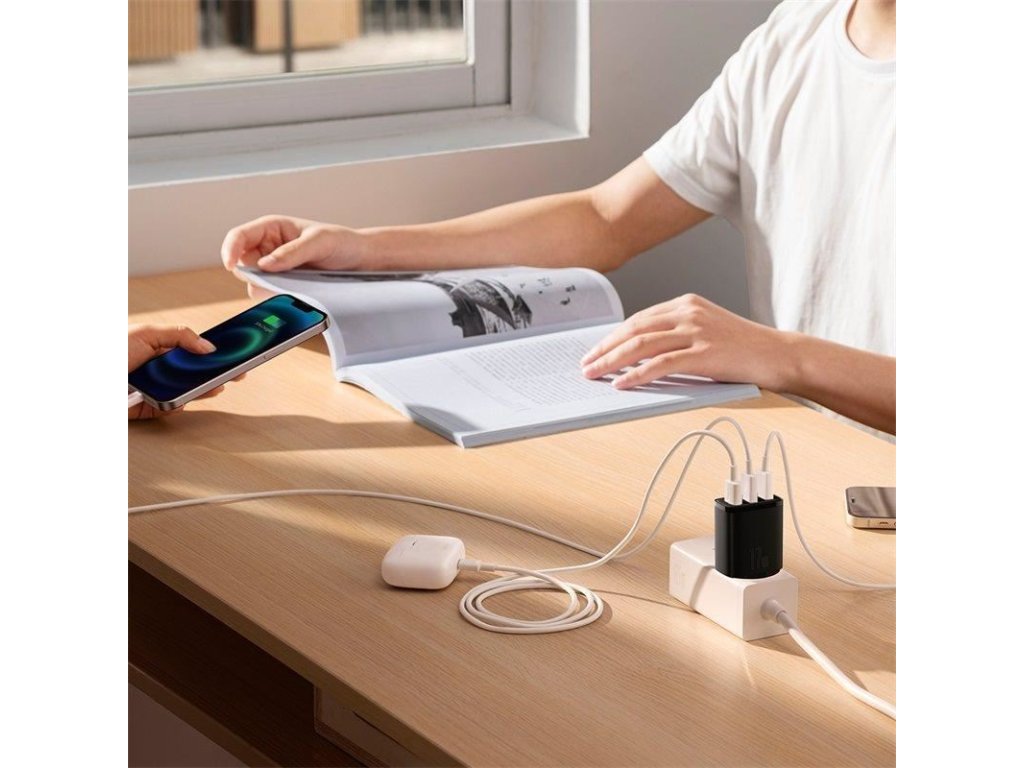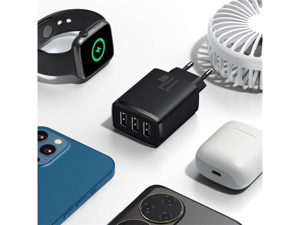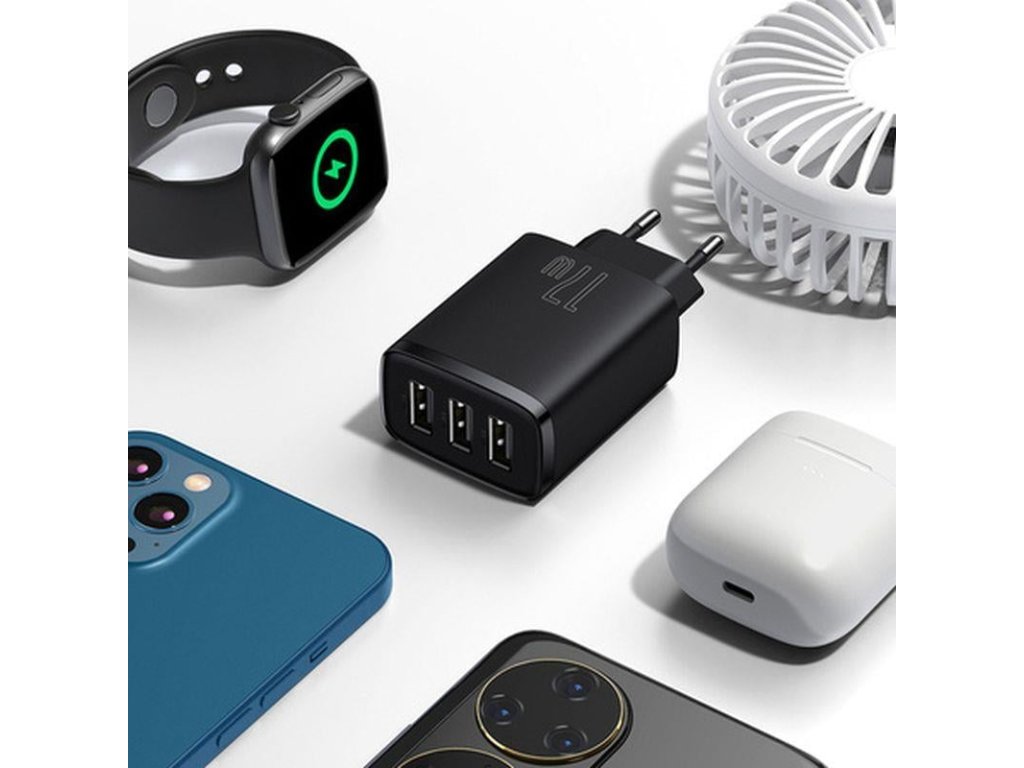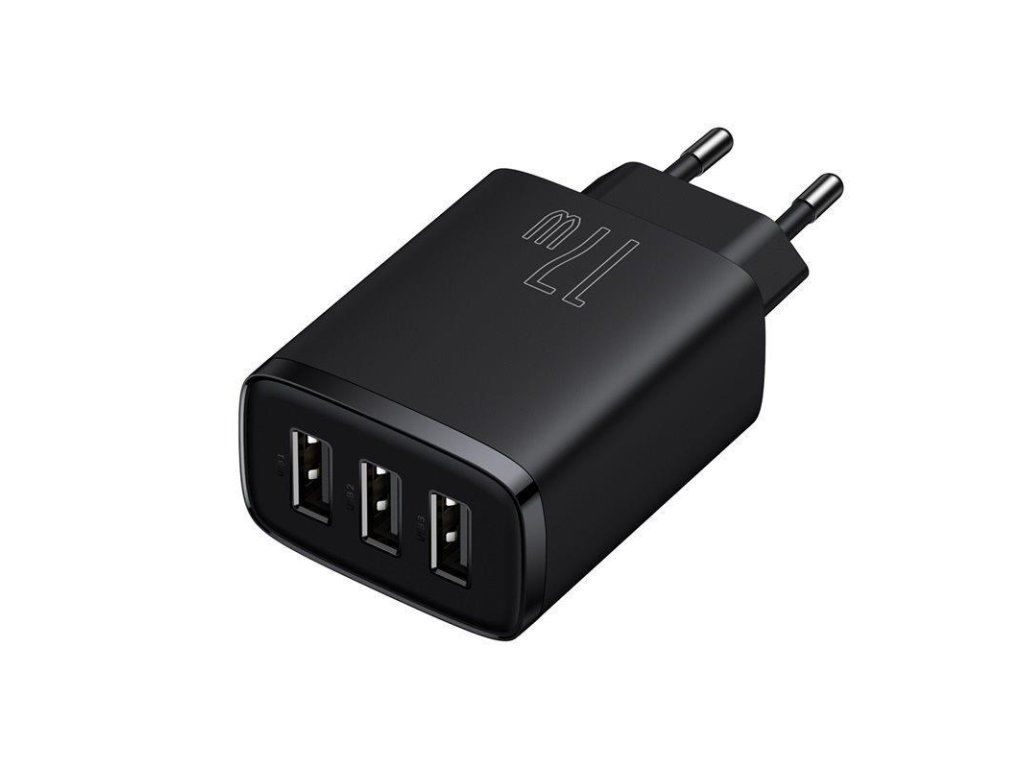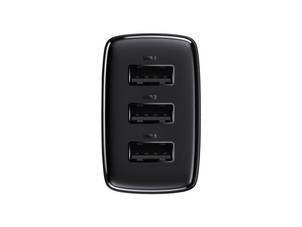 Napájecí nabíječka se třemi porty USB-A. Navrženo tak, aby fungovalo s většinou populárních zařízení napájených přes USB, jako jsou iPhony a telefony se systémem Android.