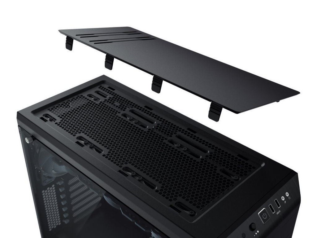 Konektory na horním panelu: 2 x USB 3.0, 1 x výstup pro sluchátka, 1 x vstup mikrofonu, regulátor otáček ventilátorů,