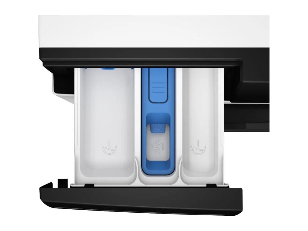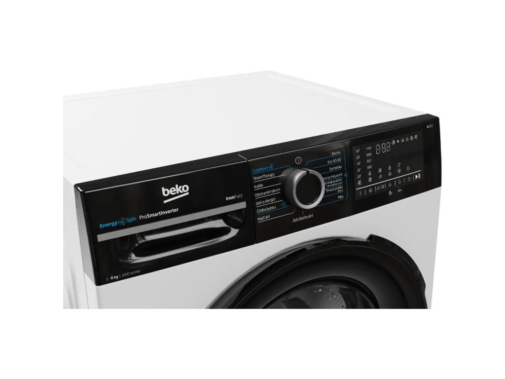 Volně stojící předem plněná pračka, kapacita 8 kg, barva bílá s černými dv. a panelem, energetická třída A, otáčky: 1400 ot/min, 15 programů, invertor. motor, funkce EnergySpin, SteamCure, SteamTherapy, IronFast, šířka 60 cm, hloubka 54,6 cm.