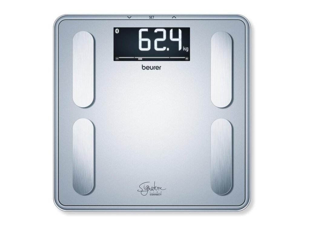 Měření tělesné hmotnosti, tělesného tuku, tělesné vody, svalů, kostní hmoty, kalorií (BMR/AMR) a BMI.