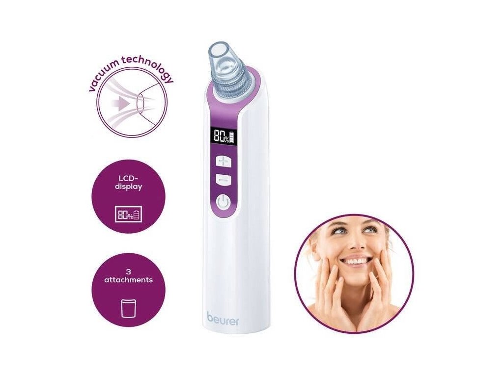 čistič pórů 3 v 1 • vakuová technologie • 3 nástavce: hloubkové čištění, prevence znečištění pleti, masáž • 5 stupňů intenzit • LCD displej vč. ukazatele stavu baterie • dobíjecí baterie • až 90 min fungování při nejsilnější intenzitě • dobíjení 5 h