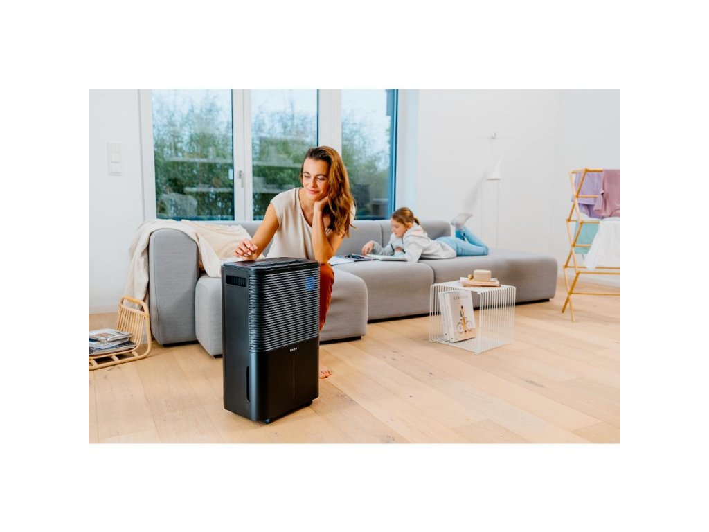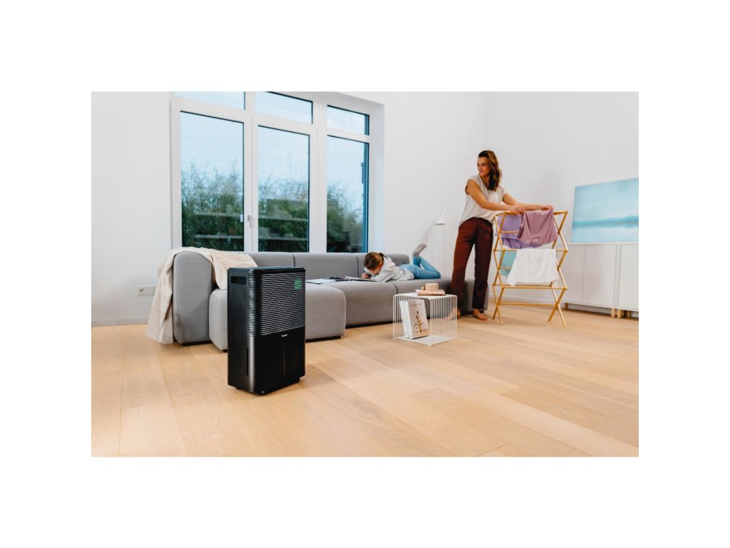 Jedním z hlavních benefitů tohoto odvlhčovače je inovativní režim sušení prádla, který zajistí rychlejší vysušení mokrého oblečení bez rizika zvýšení vlhkosti v interiéru. Zařízení automaticky přepne na nejvyšší rychlost ventilátoru a režim nepřetržitého odvlhčování, čímž efektivně zabraňuje šíření vlhkosti po domácnosti. Přehledný digitální displej umožňuje snadné ovládání a okamžité sledování aktuální vlhkosti a nastavení.