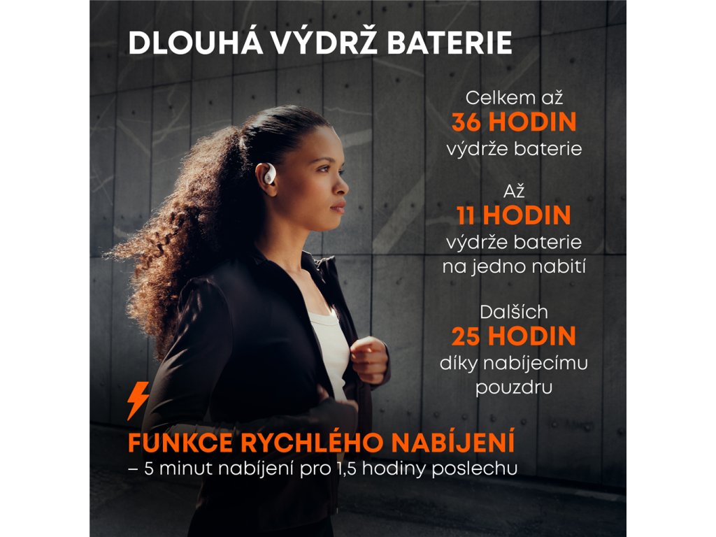 zcela bezdrátová sluchátka s otevřenou konstrukcí a klipem za ucho, ideální pro sportovní aktivity, vyvážený zvuk s podporou kvalitního audio kodeku AAC, odolné proti dešti a potu (IP54), extra dlouhá doba přehrávání až 11 hodin na jedno nabití