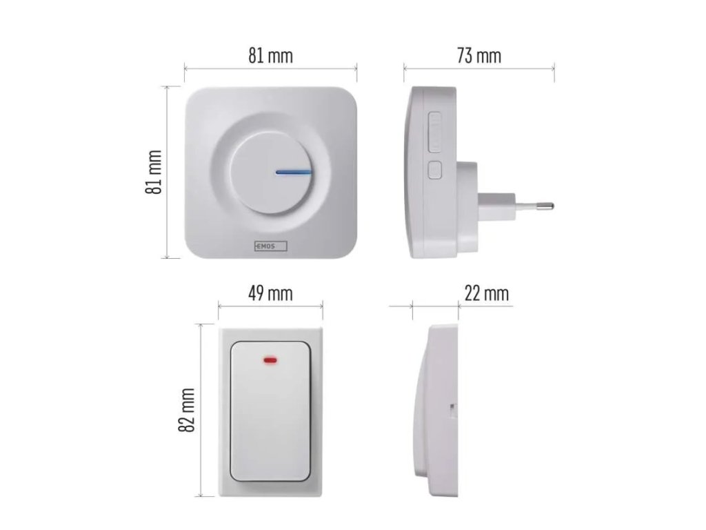Bezdrátový zvonek s bezbateriovým tlačítkem, ideální pro dům, byt či kancelář. Napájení hlavní jednotky 230 V AC, dosah tlačítka 180 m. Maximální hlasitost 90 dB, 36 melodií, možnost přidání až 6 tlačítek. Voděodolné tlačítko IP44, barva bílá