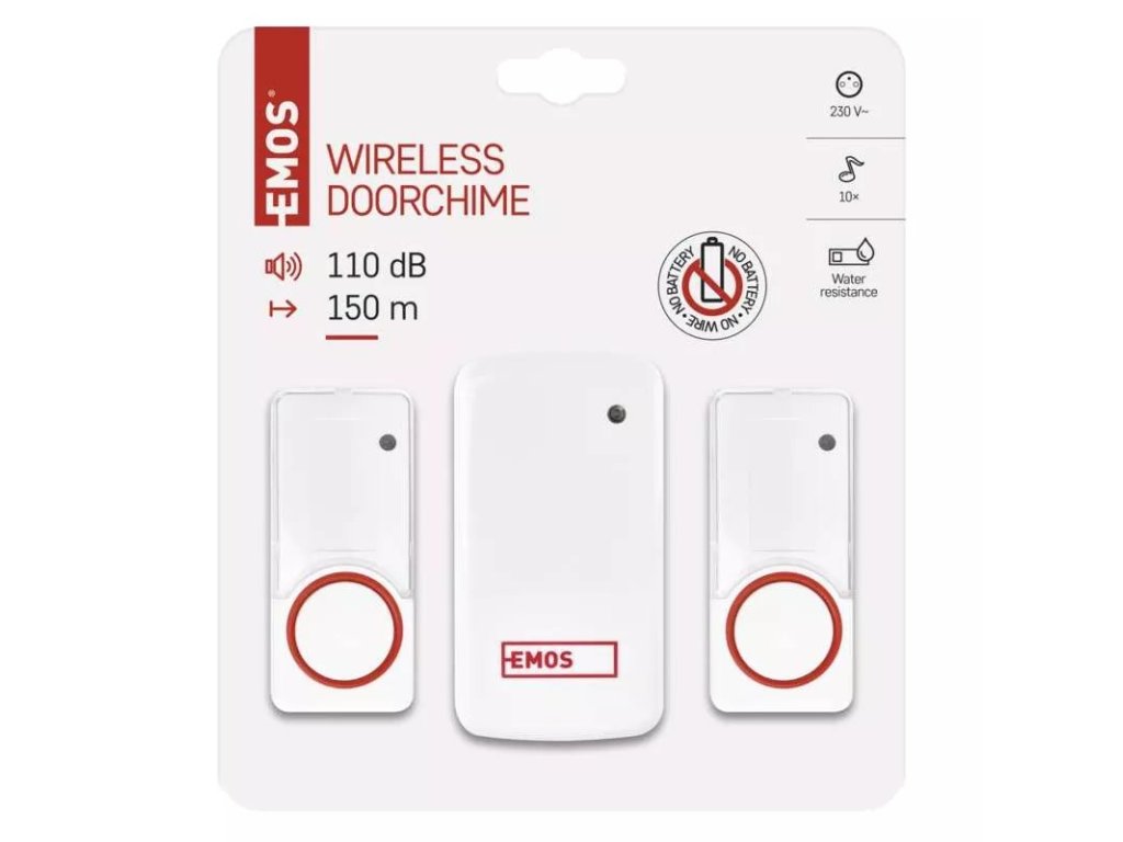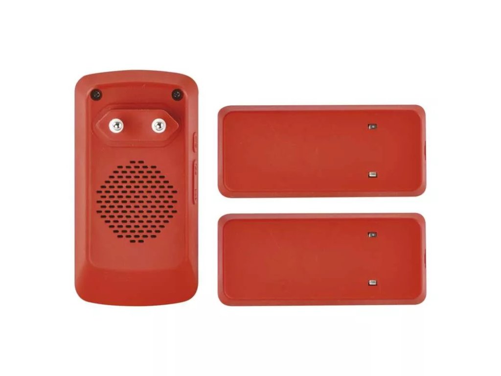 Spolehlivý bezdrátový zvonek s bezbateriovým tlačítkem, ideální pro dům, byt či kancelář. Napájení hlavní jednotky 230 V AC, dosah 150 m. Hlasitost 110 dB, 10 melodií, možnost přidání až 8 tlačítek. Voděodolnost IP44, barva červená.