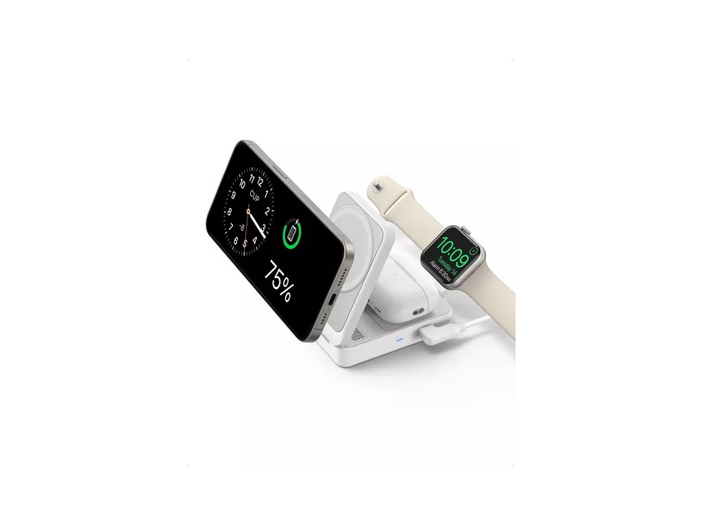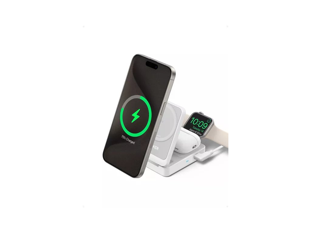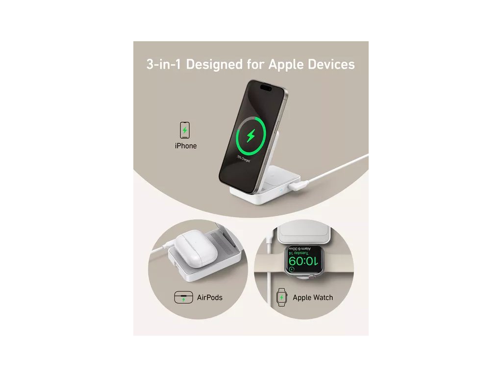 Bezdrátová nabíječka Anker MagGo B2557, ultrarychlé nabíjení výkon 15W,nabíjení s certifikací Qi2, ompatibilní s MagSafe,skládací design,3 v 1: Nabíjejte iPhone, AirPods a Apple Watch, barva bílá