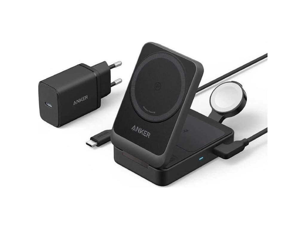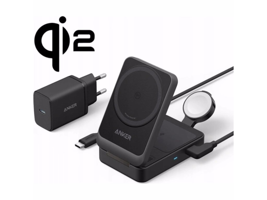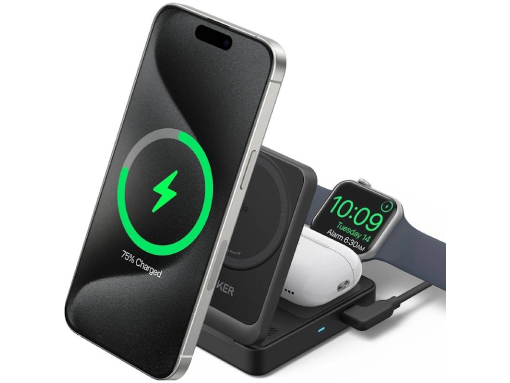 Bezdrátová nabíječka Anker MagGo B2557,výkon 15W,3 v 1: Nabíjejte iPhone, AirPods a Apple Watch, bezdrátové nabíjení kompatibilní s MagSafe, nabíjení s certifikací Qi2, ultrakompaktní skládací design, lze použít jako stojánek, rozměr (složená): 89×60×25mm