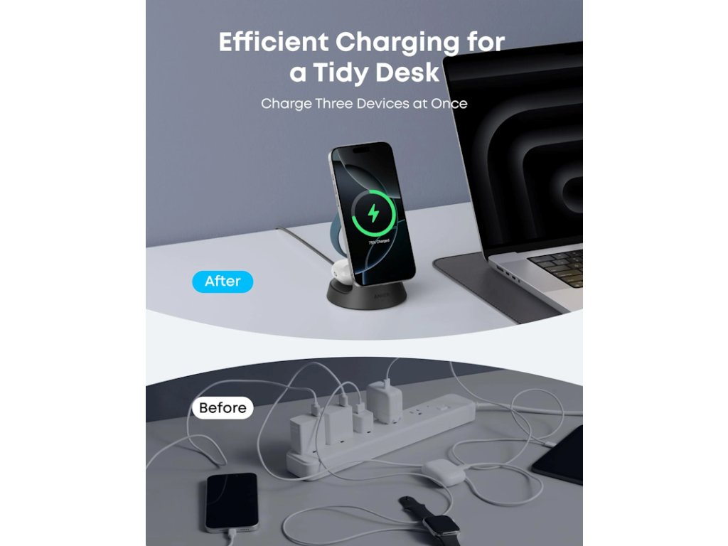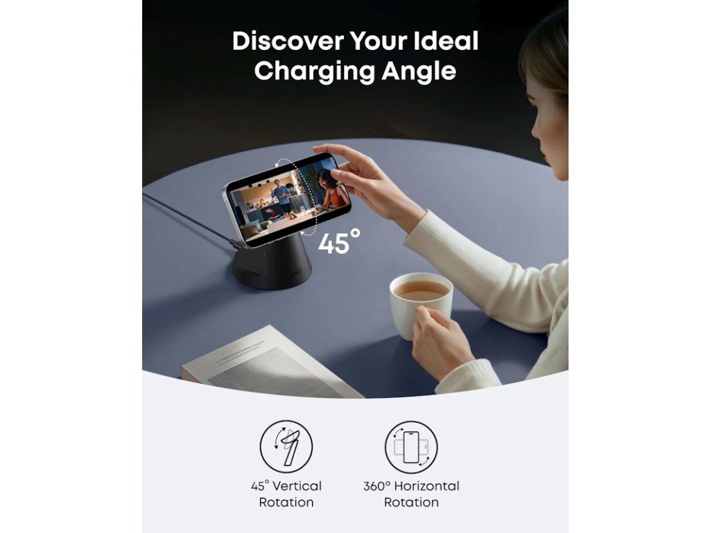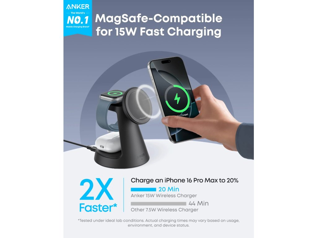 Bezdrátová nabíječka Anker MagGo B25M4,výkon 15W, technologie MagSafe, nabíjení 3 zařízení současně, nastavte si vertikální úhel až 45 stupňů, abyste našli optimální pohled na nabíjení, a užívejte si režim StandBy v orientaci na šířku,barva černá