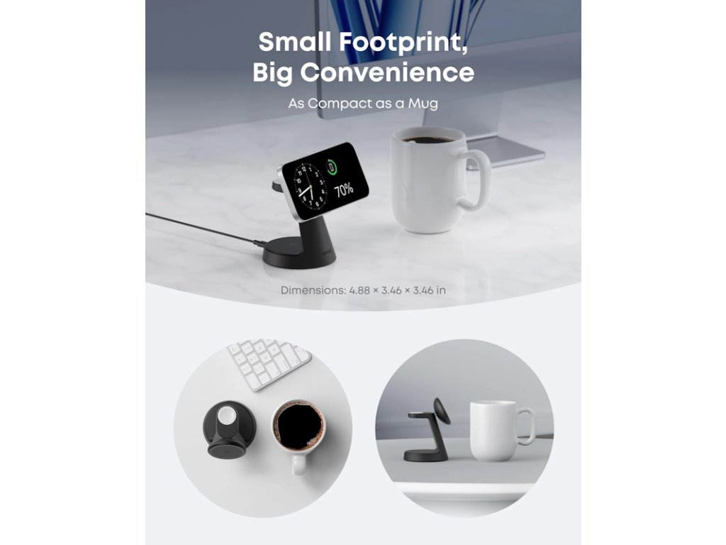 Tato kompaktní nabíječka, ideální pro nepřehledné pracovní prostory, se ideálně hodí na každý stůl a napájí vše od telefonů až po hodinky.