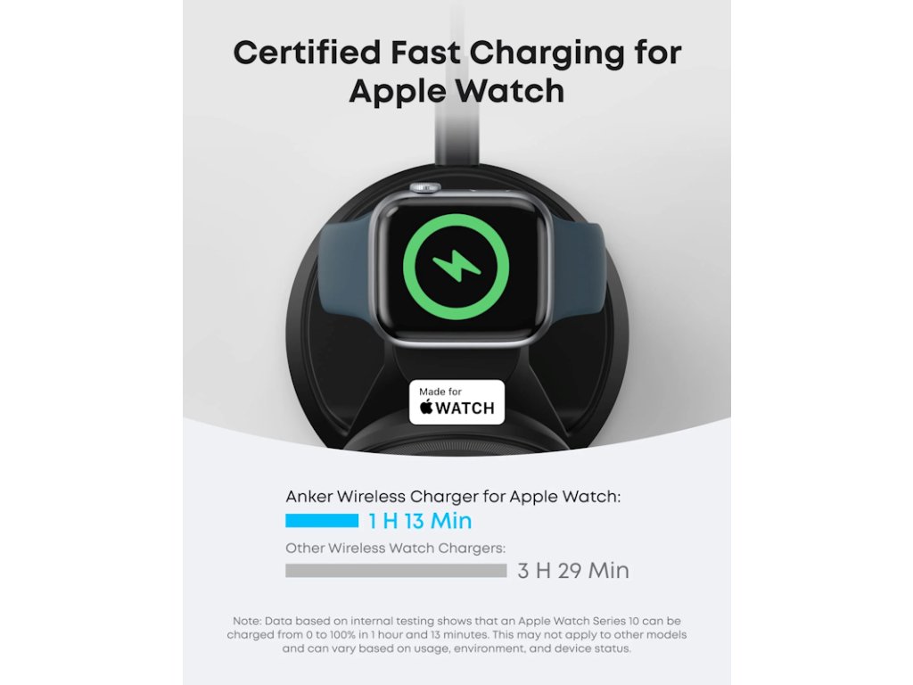 Pyšní se oficiální certifikací, která umožňuje napájet Apple Watch Series 10 z 0 na 100 % za pouhou 1 hodinu a 13 minut. (Poznámka: Údaje vycházejí z interního laboratorního testování; skutečná doba nabíjení se může lišit.)