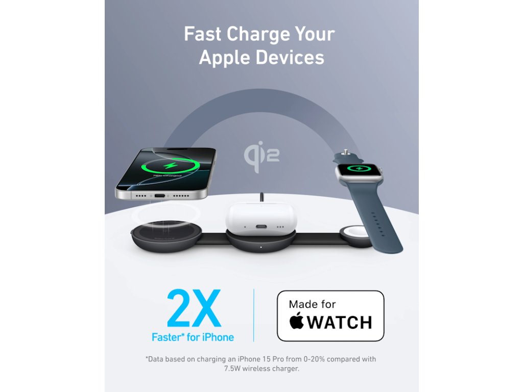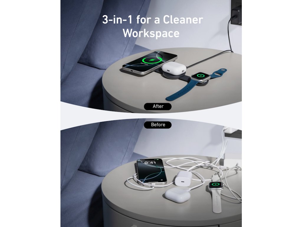 Udržujte svůj pracovní prostor nepřeplněný bezdrátovou nabíječkou 3 v 1, která napájí více zařízení současně.