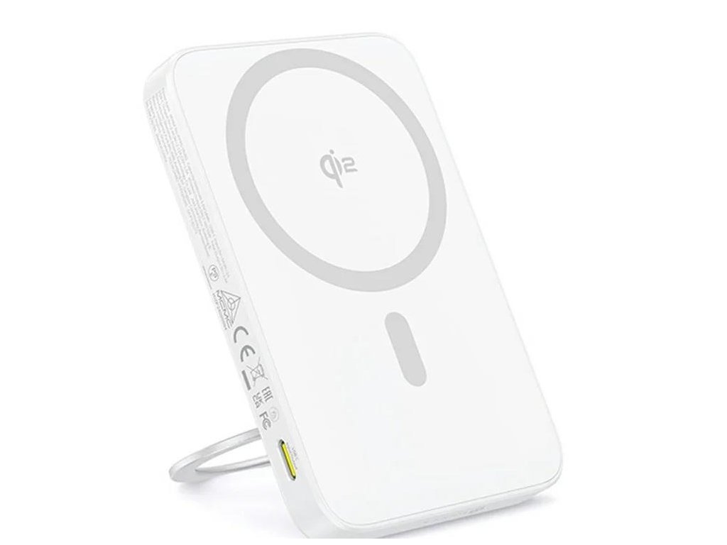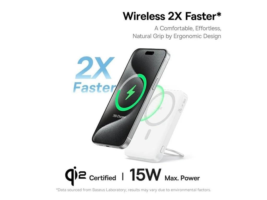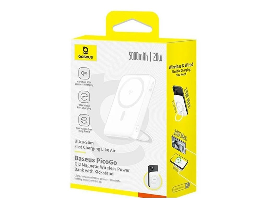 Powerbanka Baseus PicoGo Qi2, kapacita 5000mAh, 15W bezdrátové nabíjení Qi2, nabíjí 2 zařízení současně - port vUSB-C + bezdrátové nabíjení, vestavěný otočný stojan, hmotnost 170g, barva bílá