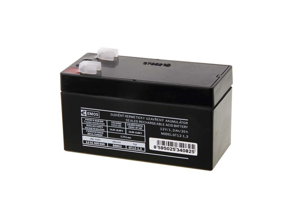 Akumulátor EMOS 12V, 1,3Ah, bezúdržbový AGM, ideální pro EZS, EPS, záložní systémy výtahů. Rozměry: 97×45×53 mm, hmotnost: 0,5 kg, životnost až 5 let. Terminál Faston 4,7 mm, optimální pro záložní baterie a požární systémy.