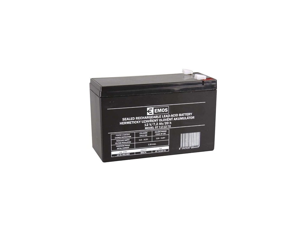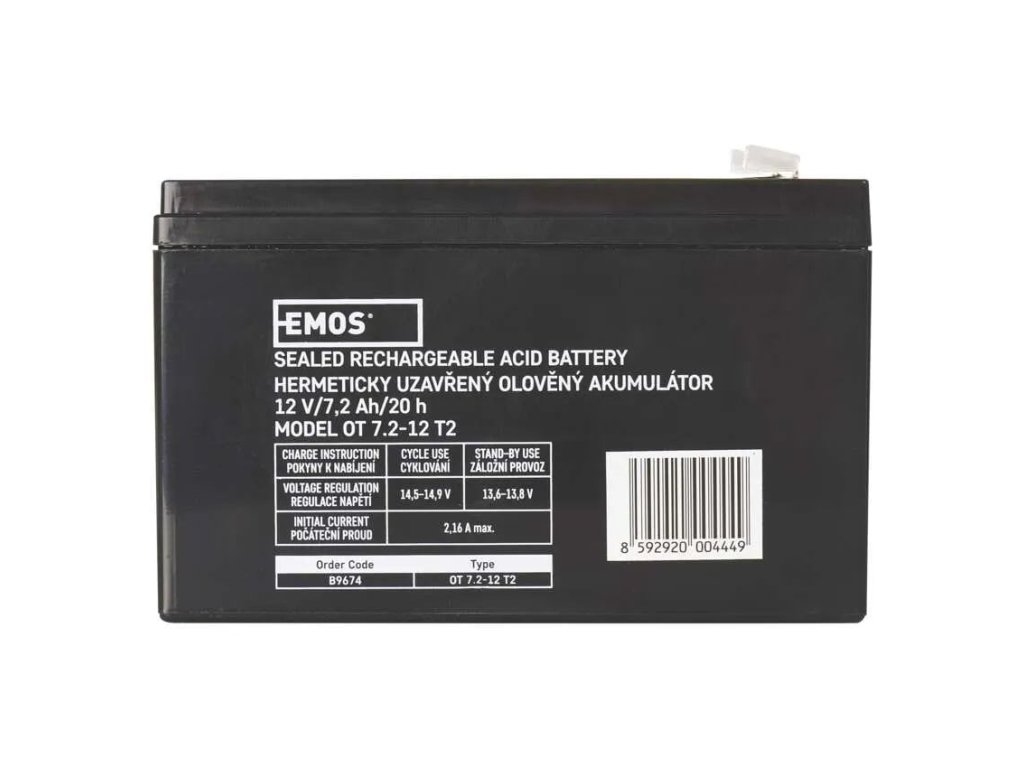 Akumulátor EMOS 12V, 7,2Ah, bezúdržbový AGM, ideální pro UPS a RBC kity. Rozměry: 151×65×94 mm, hmotnost: 2,2 kg, životnost až 5 let. Terminál Faston 6,3 mm, vhodný i pro EZS, ne pro EPS.