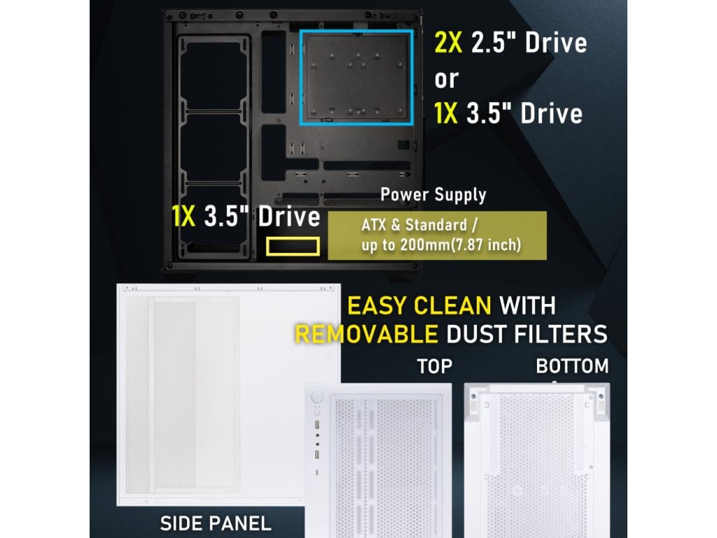 Váš počítač dokáže rozehrát pořádnou světelnou show. Prostor skříně formátu Middle Tower dokáže pojmout 360 mm dlouhý výměník vodního chlazení i grafickou kartu. Součástí skříně BitFenix CETO Cube jsou rovněž prachové filtry, které zabraňují usazování prachu uvnitř a udržují PC systém čistý a funkční. Nechybí ani snadno dostupné porty na horním panelu. Mezi nimi najdete jeden port USB-C, dvojici USB 3.0, sluchátkový výstup a vstup pro mikrofon.