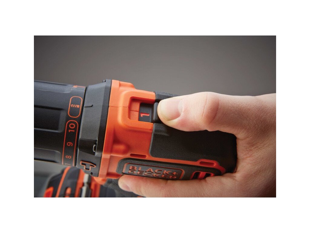 10 poloh pro nastavení kroutícího momentu zaručuje přesné ovládání při šroubování a vrtání do dřeva, kovu i plastu.