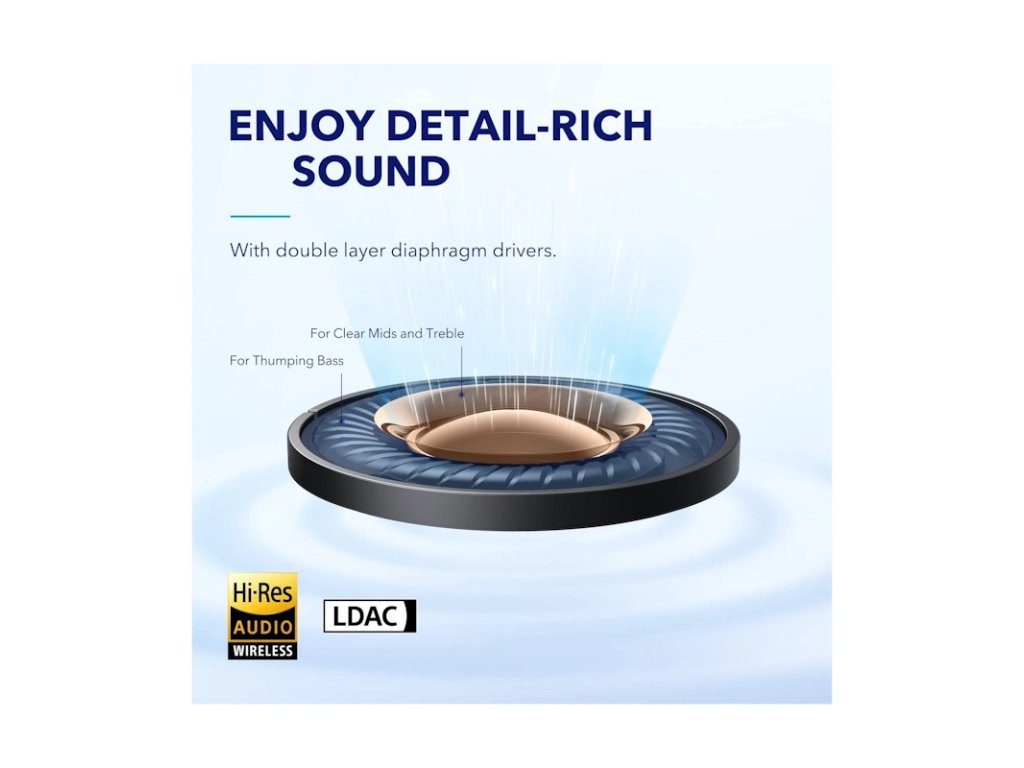 Výkonná hudba v malém baleníDíky pokročilým měničům Soundcore se dvěma membránami poskytují sluchátka Space A40 s potlačením šumu silné basy a ostré výšky. Díky režimu LDAC si můžete vychutnat i bezdrátový zvuk v kvalitě Hi-Res Audio. Bezdrátová sluchátka Space A40 s potlačením šumu jsou nejlehčí v řadě Soundcore a jsou ergonomicky navržena tak, aby pohodlně seděla v uších.