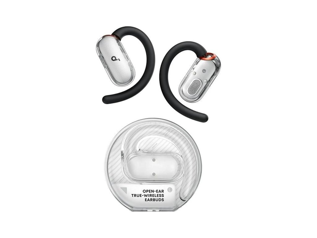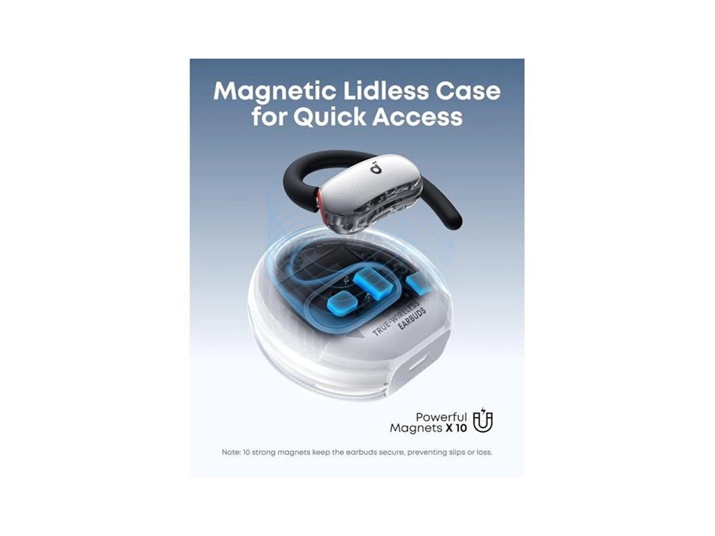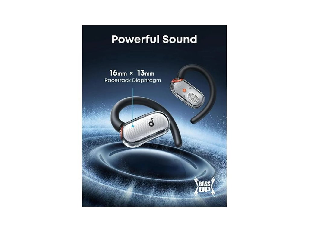 Bluetooth sluchátka Anker soundcore V40,otevřená konstrukce sluchátek,čtyřúrovňově nastavitelné ušní háčky,maximální zesílení o 7,5 dB, měniče 16 × 13 mm, vysoce elastická membrána, komora ve tvaru přesýpacích hodin = vysoká hlasitost a mohutné basy