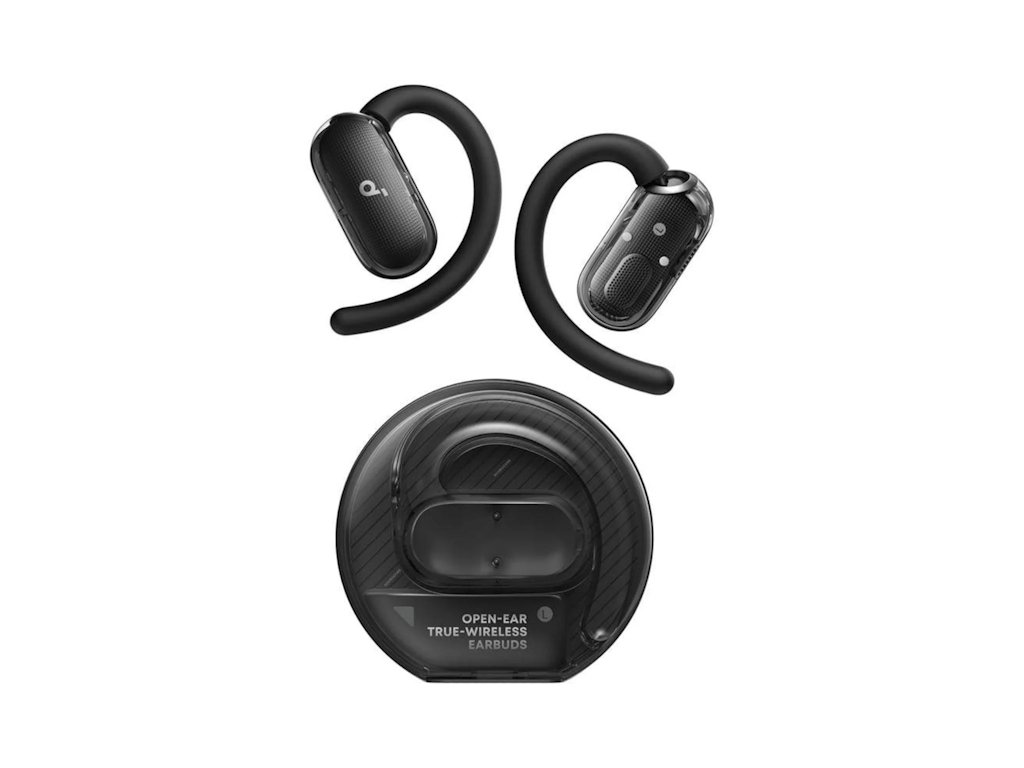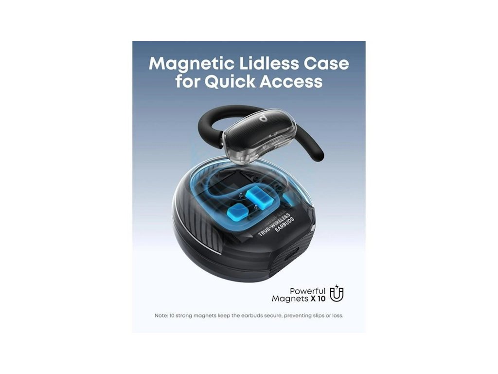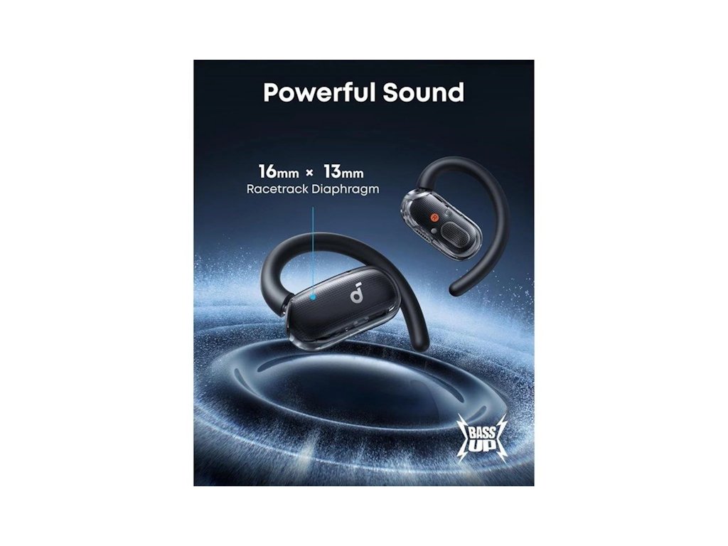 Bluetooth sluchátka Anker soundcore V40,otevřená konstrukce sluchátek,čtyřúrovňově nastavitelné ušní háčky,maximální zesílení o 7,5 dB, měniče 16 × 13 mm, vysoce elastická membrána, komora ve tvaru přesýpacích hodin = vysoká hlasitost a mohutné basy