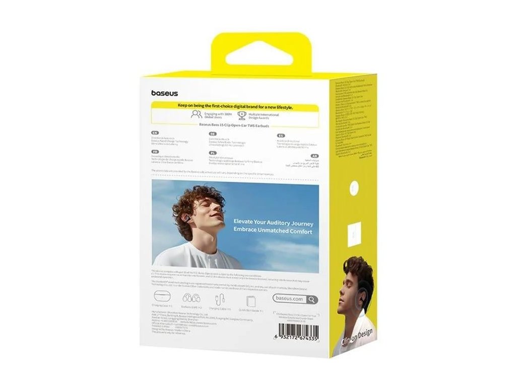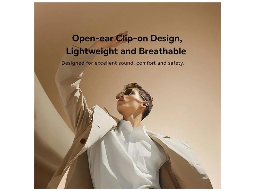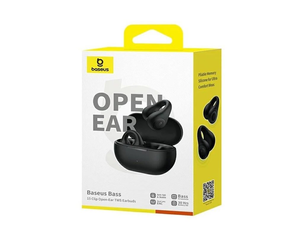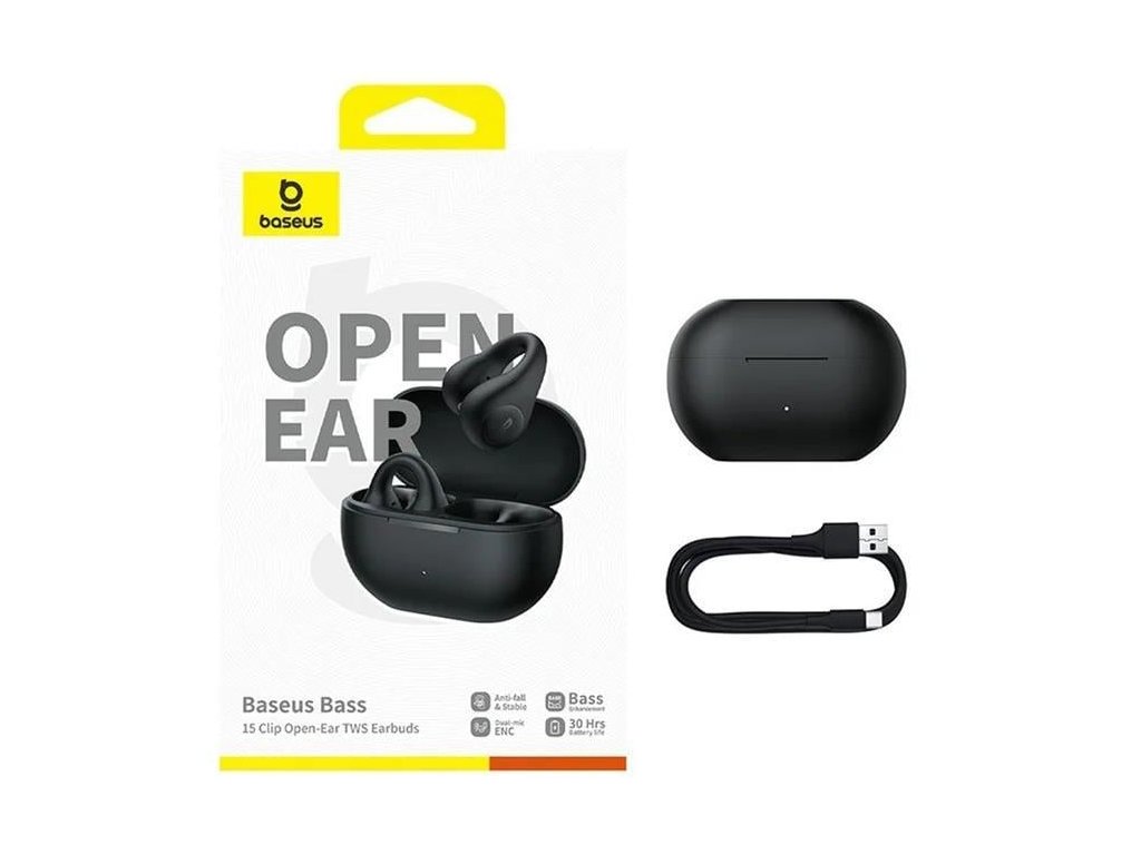 Sluchátka Baseus Bass 15 Clip Open Ear, True Wireless, Bluetooth 5.4,dosah 10m, baterie sluchátek 40 mAh, baterie pouzdra 400 mAh,doba přehrávání 7-8 hod, doba nabíjení 1,5 - 2 hod, nabíjení USB-C port, barva černá