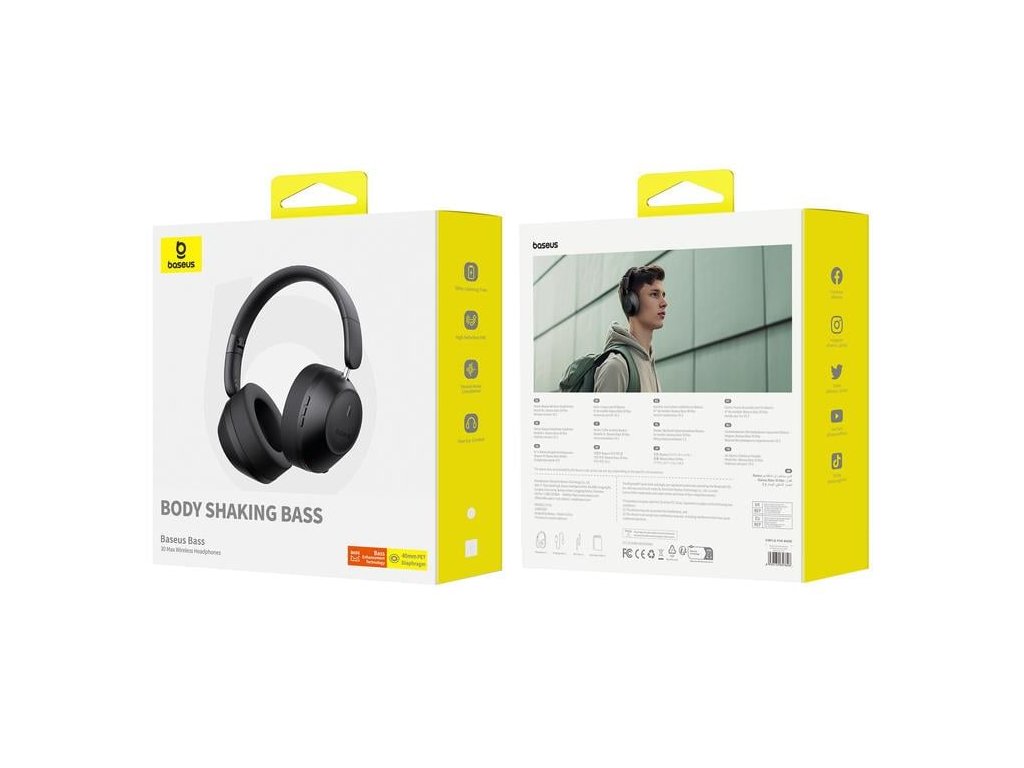 Sluchátka Baseus Bass 30 Max,Bluetooth 5.3, dosah 10m,baterie 600 mAh (až 50 hod přehrávání),2 mikrofony s technologií ENC, 40mm dynamický měnič,nabíjení USB-C port,doba nabíjení cca 2hod, barva černá