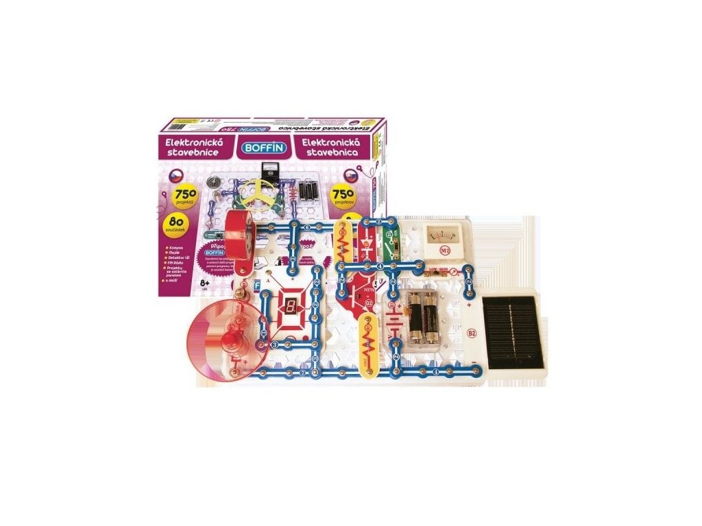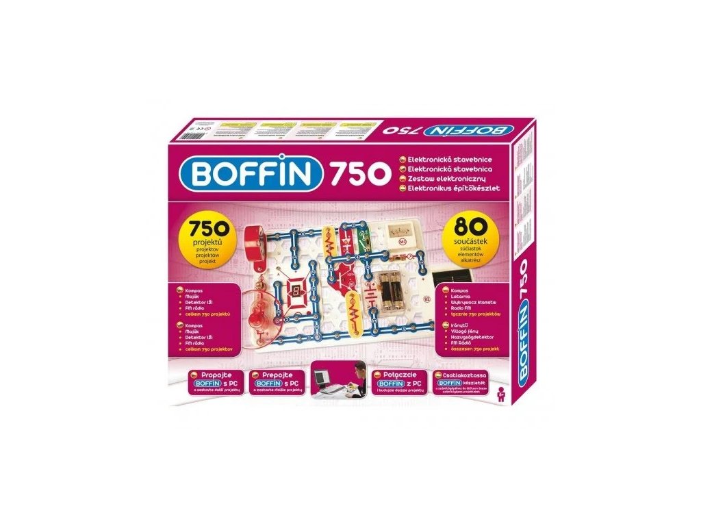 Elektronická stavebnice Boffin 750 obsahuje 80 součástek, z nichž lze postavit 750 projektů, např. kompas, maják, detektor lži, FM rádio aj.