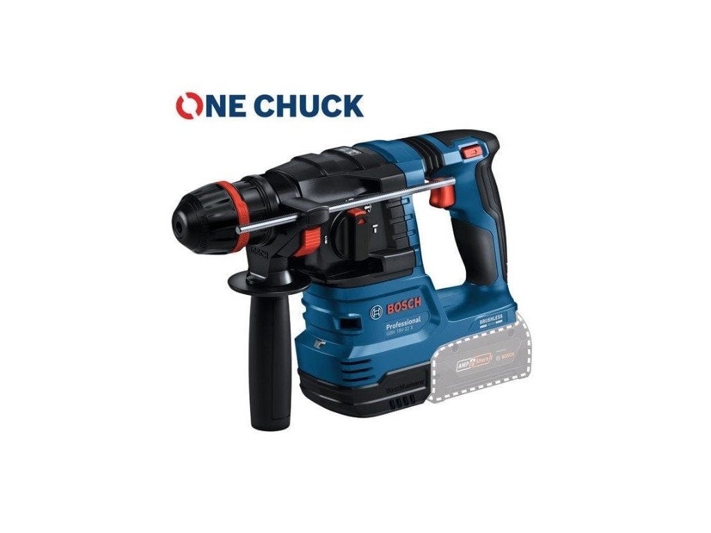 Aku vrtací kladivo SDS plus • 18,0 V • 2 J energie příklepu • ONECHUCK • Max. vrtání: Beton 22 mm (optimálně 6–12 mm), Dřevo 26 mm, Kov 13 mm • Až 4675 příklepů/min • Bezuhlíkový motor s konstantní rychlostí • KickBack Control, Vibration Control