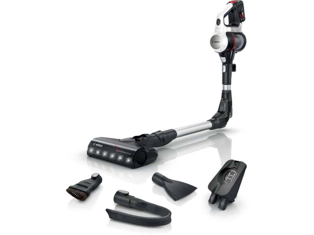 Tyčový vysavač, 2v1, bezsáčkový, objem nádoby 0,3 l, hlučnost 82 dB, baterie Li-Ion 18 V, doba provozu 40 min, doba nabíjení 5 h, filtr s membránou Pure Air, motorizovaný kartáč, kartáč na čalounění a nábytek, hubice dlouhá flexibilní, LED osvětlení