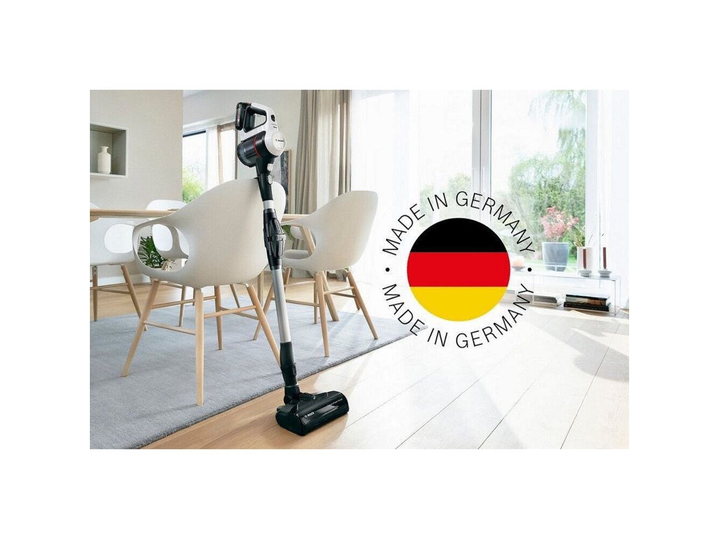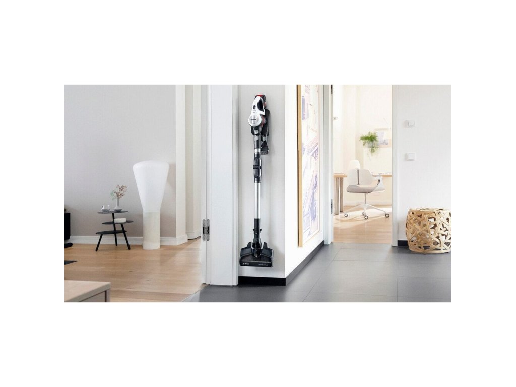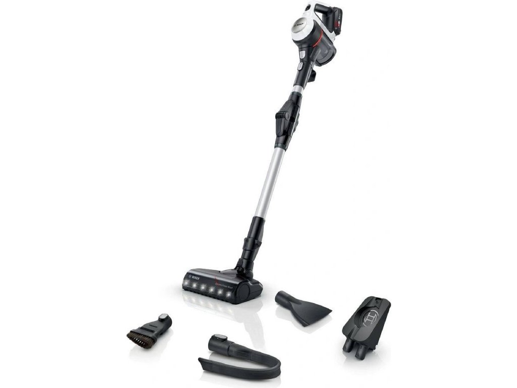Tyčový vysavač, 2v1, bezsáčkový, objem nádoby 0,3 l, hlučnost 82 dB, baterie Li-Ion 18 V, doba provozu 40 min, doba nabíjení 5 h, filtr s membránou Pure Air, motorizovaný kartáč, kartáč na čalounění a nábytek, hubice dlouhá flexibilní, LED osvětlení