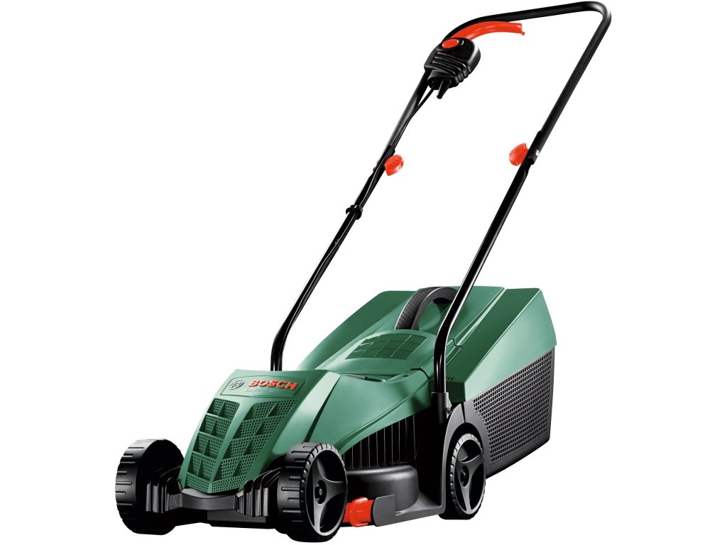 Lehká elektrická sekačka, 1 200 W, záběr 32 cm, 3 výšky sečení 25–65 mm, koš 31 l, pro plochy do 300 m2.