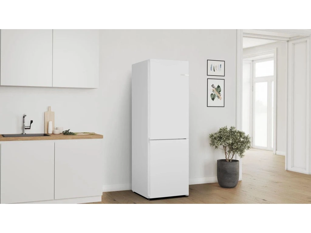 Kombinovanou chladničku Bosch KGN362WDF nebudete muset nikdy odmrazovat díky technologii Total No Frost. V zásuvce VitaFresh XXL naleznete dostatek prostoru i optimální podmínky pro uchování čerstvé ovoce, zeleniny a masa. Ve spotřebiči proudí vzduch rovnoměrně, a je tak udržována konstantní teplota bez jakýchkoliv výkyvů. Senzory FreshSense navíc hlídají teplotu jak uvnitř, tak vně lednice a sebemenší rozdíly ihned vyrovnají. Celý prostor chladničky je osvícen pomocí úsporných LED žárovek. Při umístění ledničky do vaší domácnosti se nemusíte jakkoliv omezovat. Lednice nepotřebuje kolem sebe prostor navíc. Jednoduše ji přistavíte těsně ke zdi nebo k jinému spotřebiči.