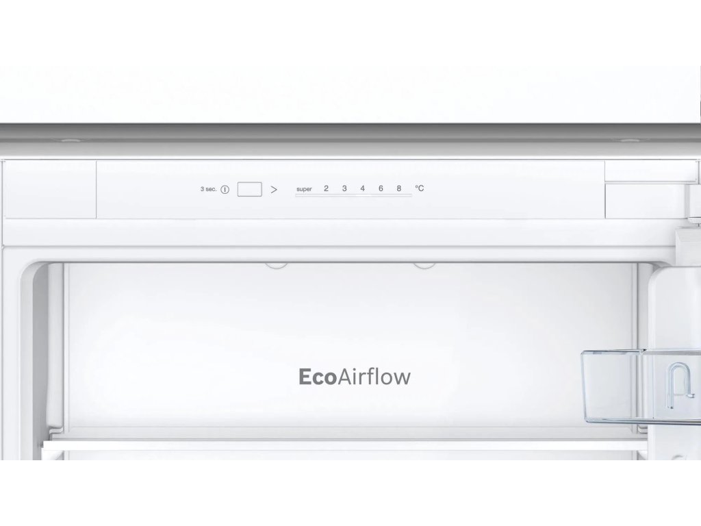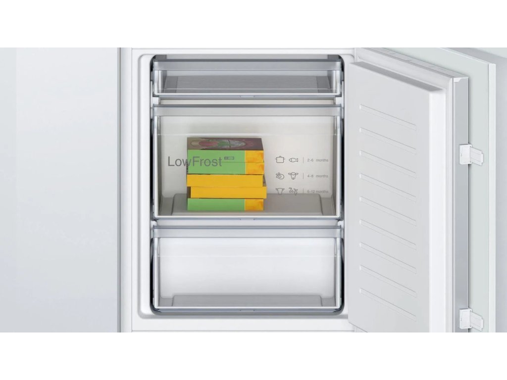 Vestavná kombinovaná lednička s mrazákem dole, objem 183/84 l, energetická třída E, brava bílá, Low Frost, Eco Airflow, funkce SuperMrazení, LED osvěltení, hlučnost 35 dB, šířka 54,1 cm, výška 177,2 cm.