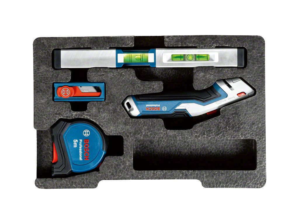 Součástí dodávky je magnetická vodováha 25 cm, svinovací metr 5 m a výsuvný nůž na koberce včetně 13 náhradních čepelí (3 čepele v rukojeti nože a 10 dalších náhradních čepelí). Sada se dodává v poloviční vložce, která je kompatibilní s mobilním systémem Bosch L-BOXX.