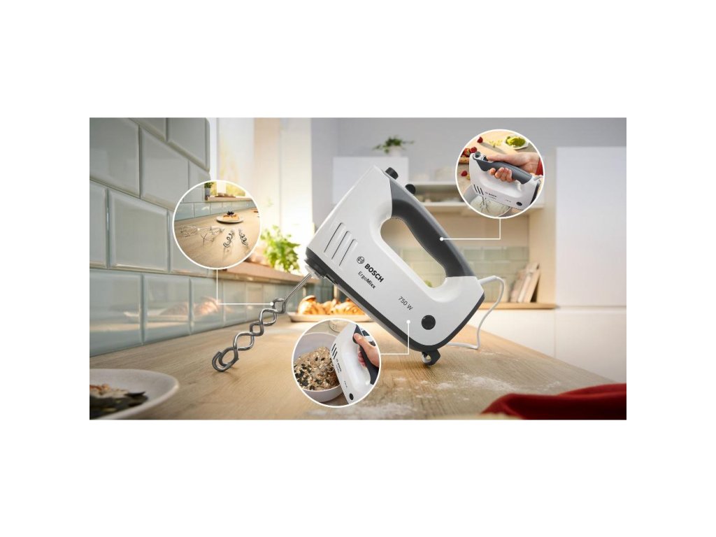 Ruční šlehač, ergonomický tvar, měkčená rukojeť, turbo metly a hnětací háky, příkon 750 W, 5 rychlostí, turbo, tichý provoz, délka přívodního kabelu 130 cm