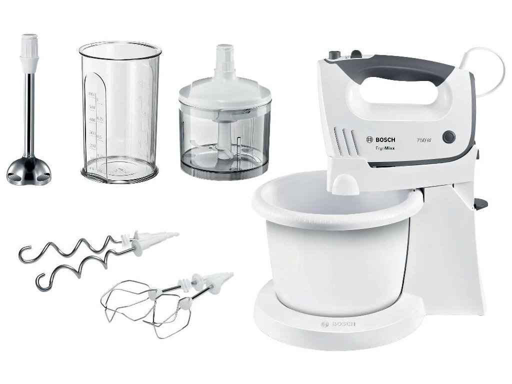 ruční šlehač s mísou • příkon 750 W • ergonomický design • SoftTouch povrch rukojeti • 5 rychlostních stupňů • turbo rychlost • 2 turbometly • 2 hnětací háky • mísa 3 l • tichý chod