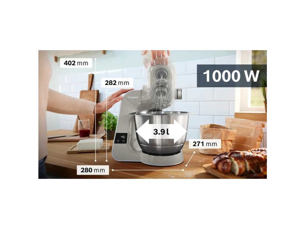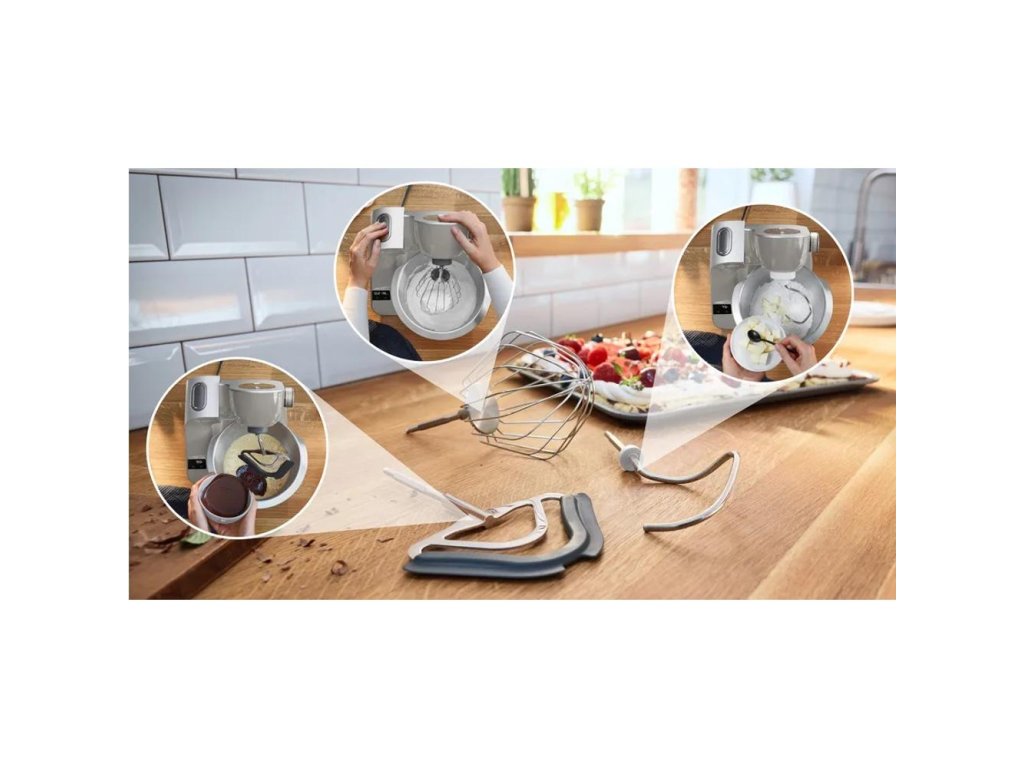 kuchyňský robot • planetární způsob míchání • příkon 1000 W • objem mísy 3,9 l • materiál mísy nerez • počet rychlostí 7 • integrovaná váha • šlehání, mísení, hnětení, mletí, krouhání, míchací metla