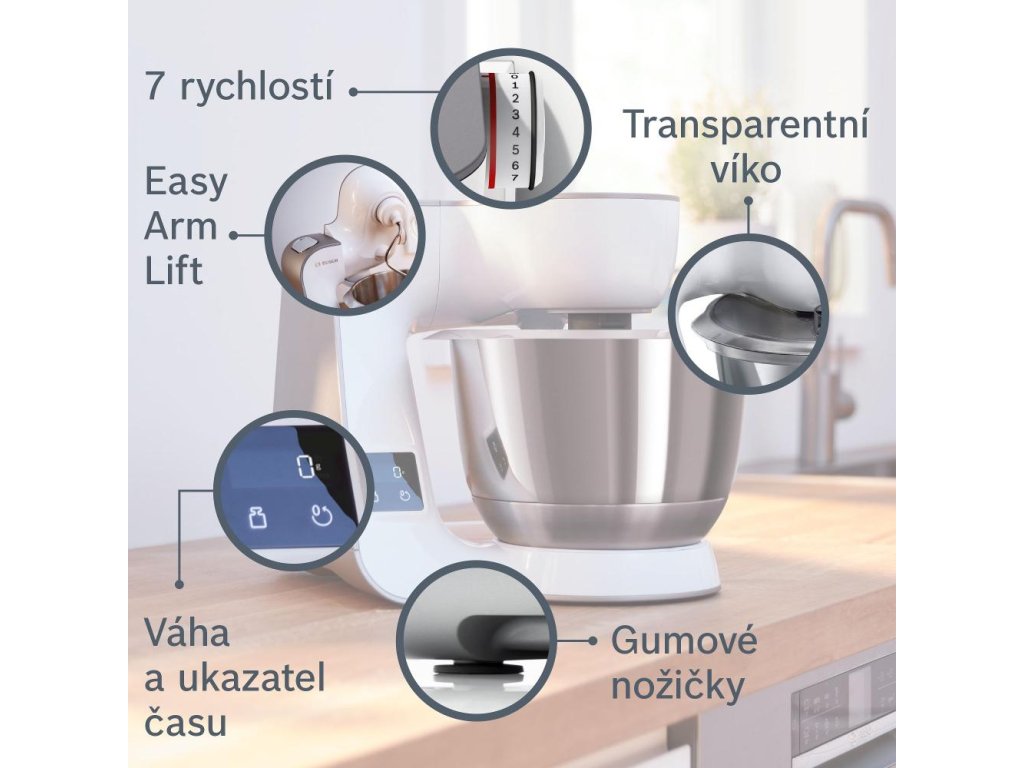kuchyňský robot • planetární způsob míchání • příkon 1000 W • objem mísy 3,9 l • materiál mísy nerez • počet rychlostí 7 • integrovaná váha • šlehání, mísení, hnětení, krouhání, míchací metla