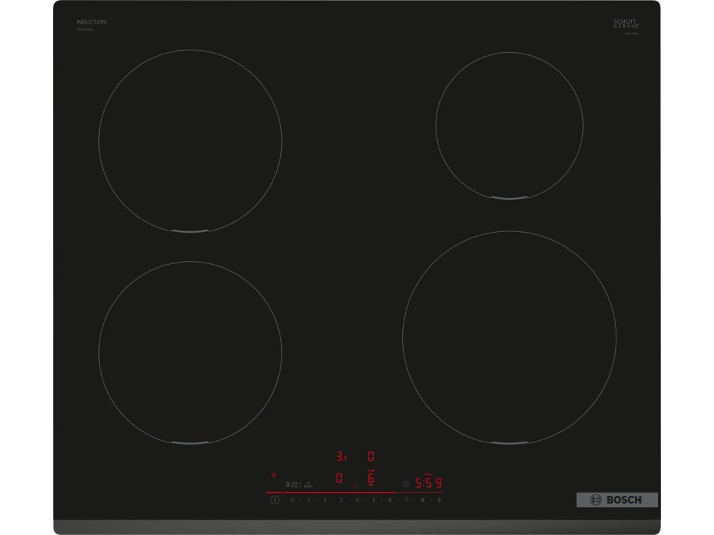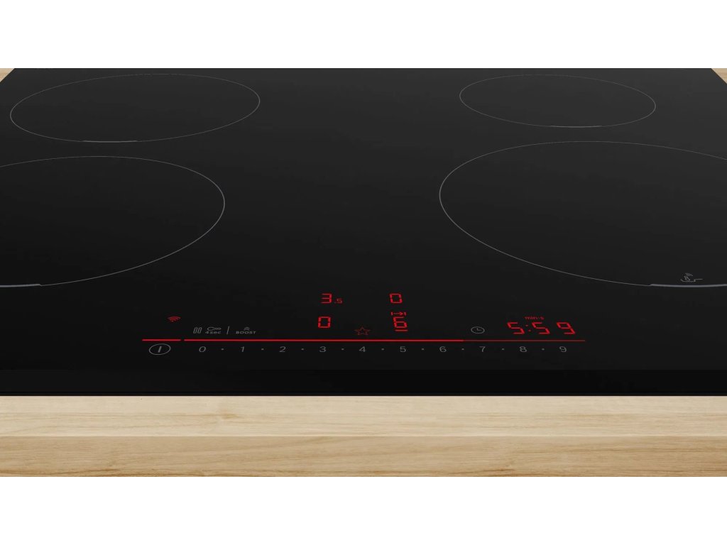 Indukční sklokeramická vestavná varná deska, 4 varné zény, barva černá, připojení 220–240 V / 400 V, dotykové ovládání DirectSelect+, Home Connect, funkce PowerBoost, HoodControl, šířka 59,2 cm,