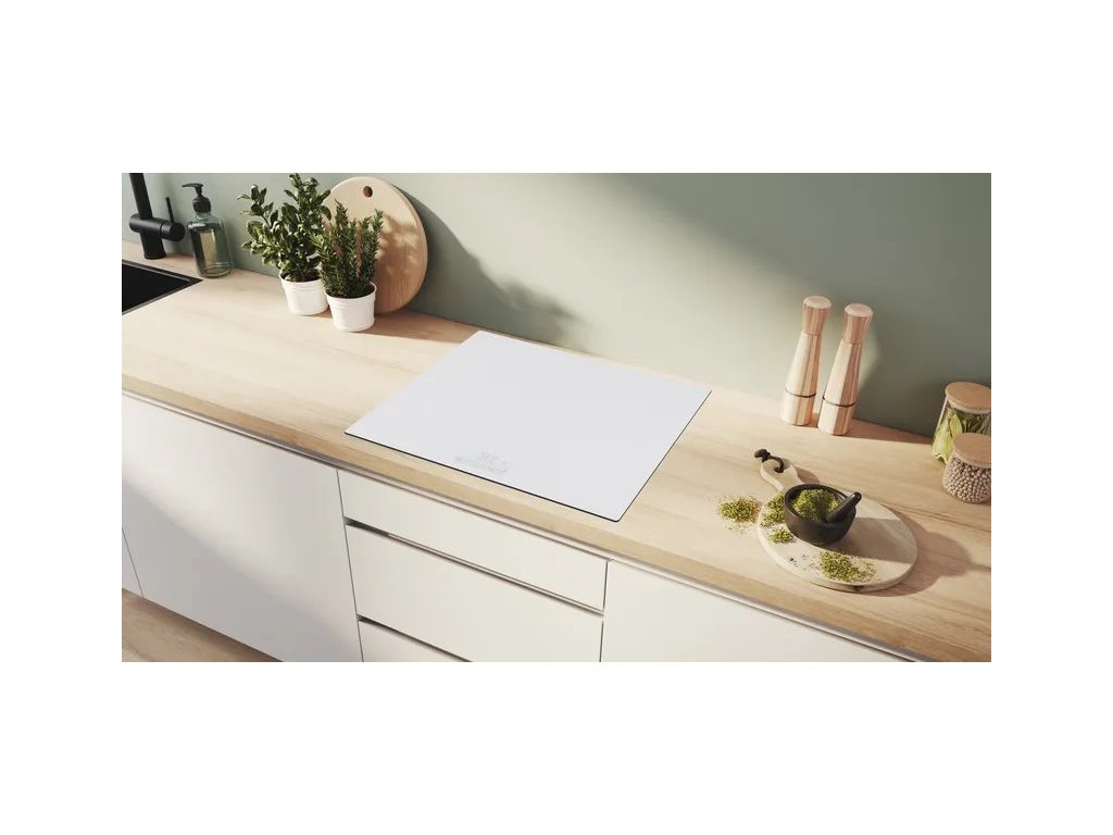 Indukční sklokeramická vestavná varná deska, šířka 60 cm, barva bílá, ovládání TouchSelect, funkce PowerBoost, QuickStart a ReStart.