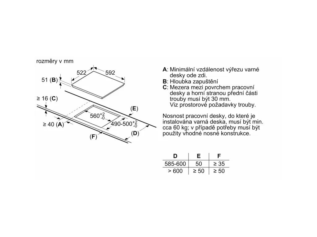 Požadovaná velikost otvoru pro instalaci (v x š x h): 51 x 560-560 x 490-500 mm
