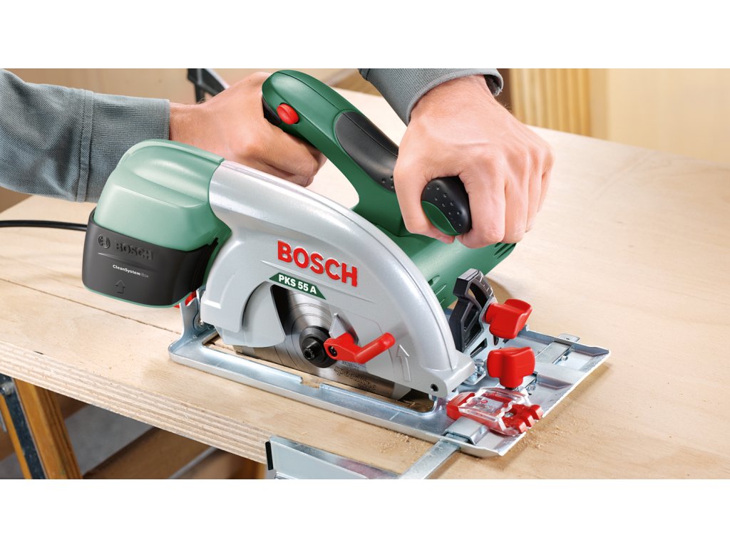 Přesnost a kontrola – využívejte integrovaného bočního dorazu okružní pily PKS 55 A pro přímé řezání podél linie řezu. Upravte hloubku řezu a úhel podle každého konkrétního řezu pomocí integrovaných upínacích páček. CutControl zajišťuje přehled a umožňuje provádění přesných řezů podél vyznačených linií. Je určeno pro přímé řezy do dřeva. Aretace vřetena pily umožňuje výměnu kotoučů. CleanSystemBox zajišťuje sběr odřezků pro čistší pracoviště. Patka je vybavena drážkou, která pasuje do systému vodicích lišt.