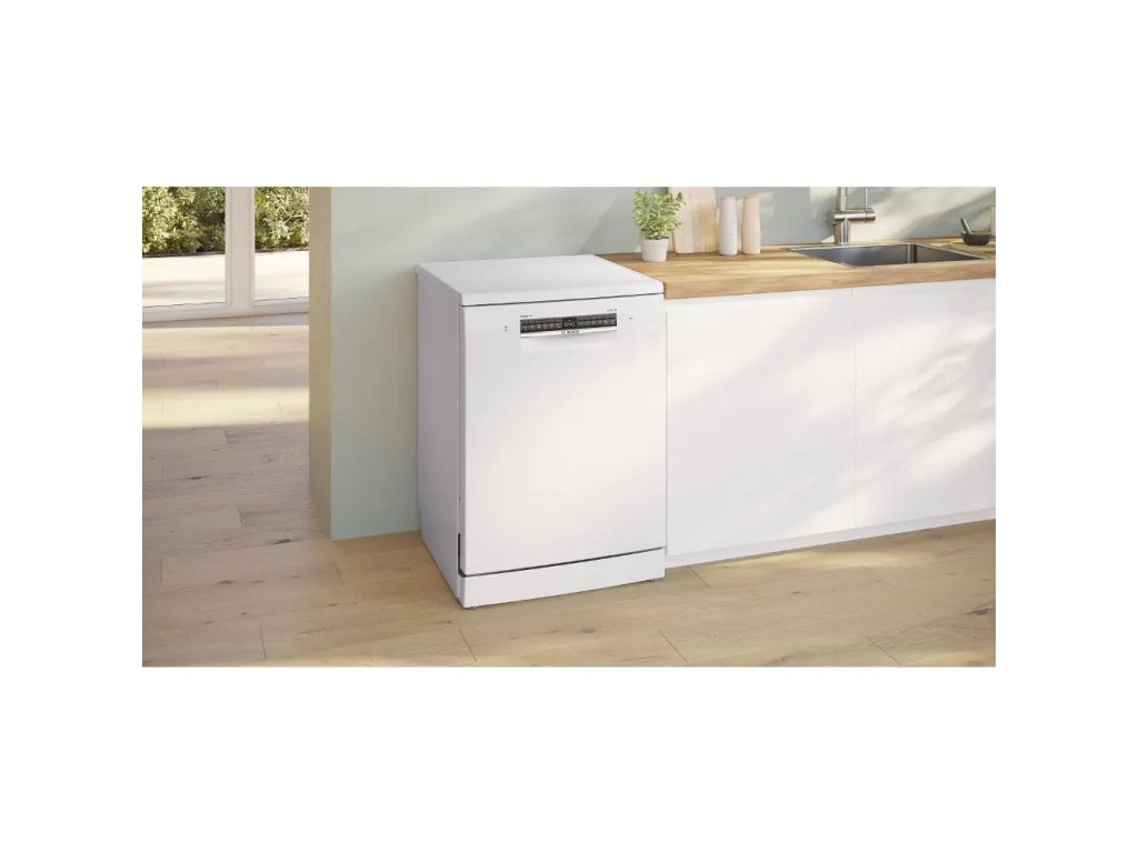 Volně stojicí myčka nádobí, barva bílá, energetická třída B, kapacita sad nádobí: 14, 5 +1 mycích programů, přiborová zásuvka, automatické otevírání dveří, připojení přes mobilní aplikaci, technologie EfficientDry, doživotní záruka AquaStop, šířka 60 cm.