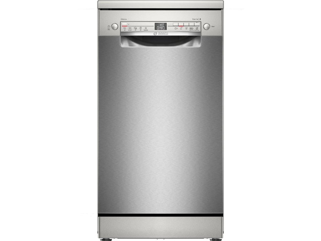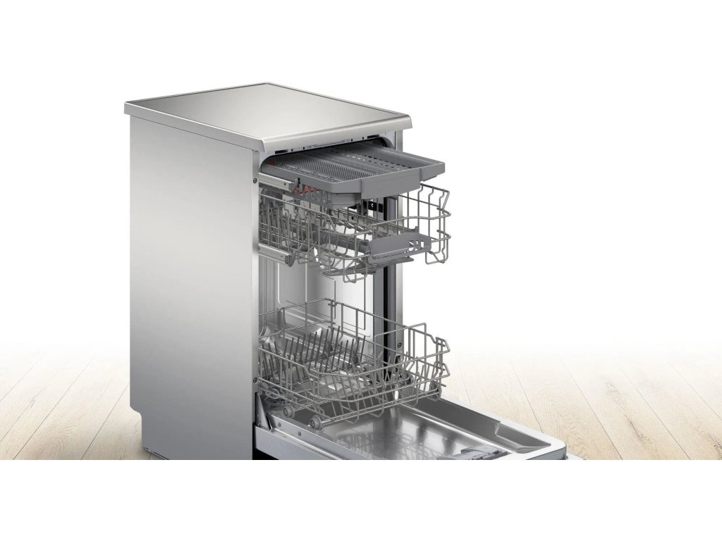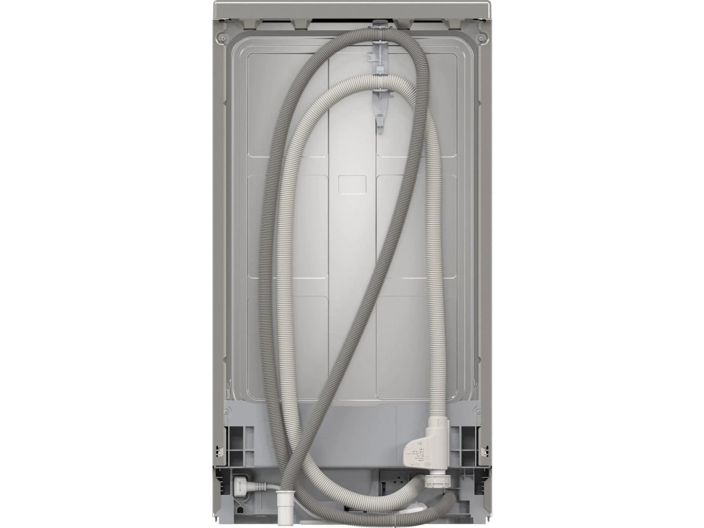 Volně stojící myčka nádobí, barva nerez, energetická třída E, kapacita sad nádobí: 10, 5 mycích programů, přiborová zásuvka, připojení přes mobilní aplikaci, tichý motor EcoSilence Drive, funkce Extra Dry, šířka 45 cm.
