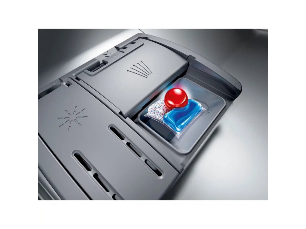 Myčka je vybavena systémem košů Vario a praktickou příborovou zásuvkou VarioDrawer. Díky systému Rackmatic lze horní koš, ve kterém je umístěné ostřikovací rameno DuoPower, nastavit do 3 poloh, a tak si jej snadno přizpůsobíte různým typům nádobí. K bezpečnému uložení talířů slouží 2 řady sklopných trnů ve spodním koši, zatímco v horním koši je výklopný etažér na šálky. Snadnou manipulaci s dolním košem zajistí kolečka s nízkým třením a zarážka proti vykolejení. Myčka Bosch s výměníkem tepla se umí automaticky přizpůsobit druhu mycího prostředku a je vybavena senzorem znečištění vody a samočisticím filtračním systémem s třívrstvým zvlněným filtrem.