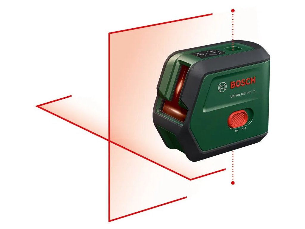 Projekce laseru: Promítá červené laserové čáry s pracovním dosahem 12 metrů a úhlem rozevření 100°. Funkce kolmého paprsku (červený laserový bod) usnadní přesné přenesení bodu.