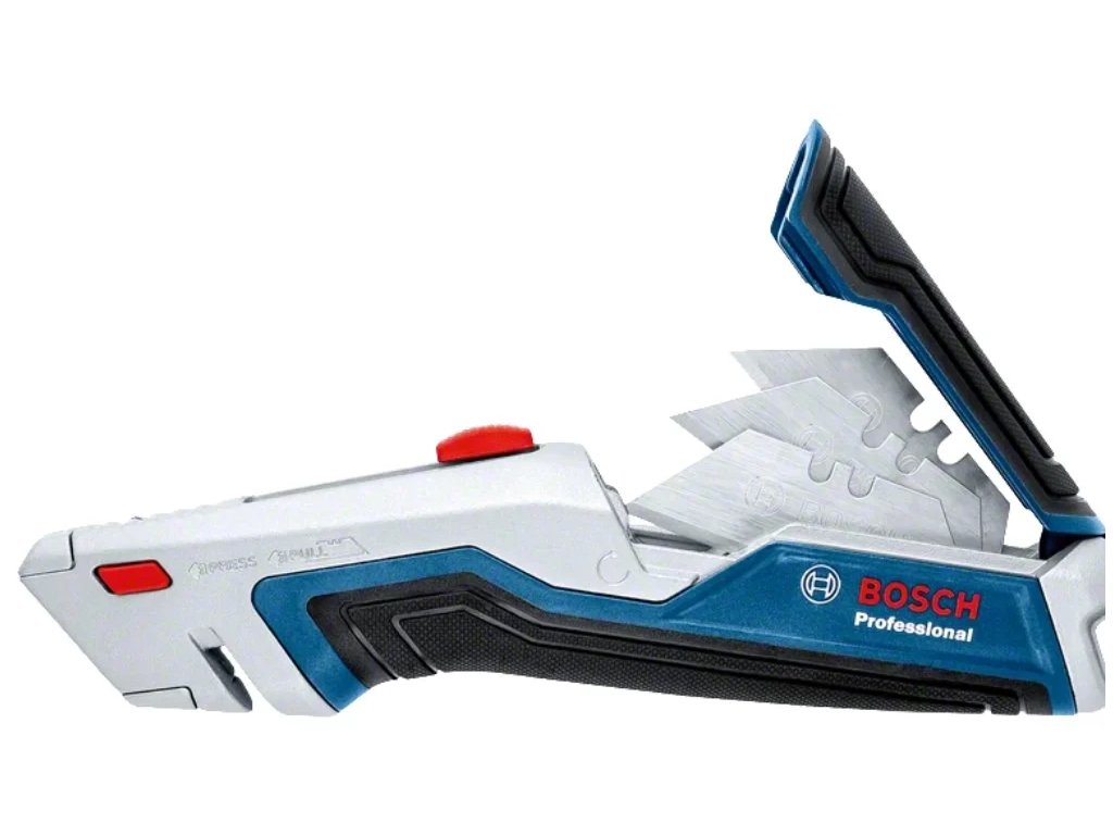 Tento vysouvací užitkový nůž Bosch Professional je robustní, všestranný a univerzální, ideální na řezání koberců, kabelů i dalších tvrdších materiálů. Má odolné hliníkové pouzdro a ergonomické tělo s měkkým úchopem. Umožňuje rychlou výměnu čepele bez nástrojů (Rychlovýměnný systém nože) a bezpečné a účinné používání jednou rukou díky extra velké opěrce palce a možnosti vysunutí čepele do tří poloh. V rukojeti jsou uloženy tři náhradní čepele.
