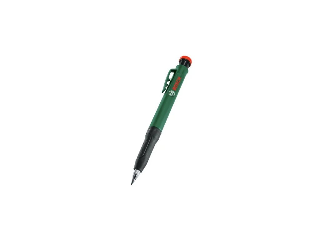Nadšení kutilové ocení vysokou kvalitu, flexibilitu a efektivitu značkovací tužky do hlubokých otvorů Bosch. Tužka je vybavena odnímatelným víkem, takže se kromě značení rovných ploch po sejmutí víka hodí také na snadné a flexibilní značení do hlubokých otvorů. Grafitová tuha špičkové kvality zajišťuje značkování různých materiálů, včetně kamene, betonu, cihel, dřeva a papíru. Tužka má vždy ostrý hrot a je připravena k použití díky zabudovanému ořezávátku. Na tužku se díky její robustní konstrukci a nerezové trubičce můžete spoléhat po dlouhá léta.