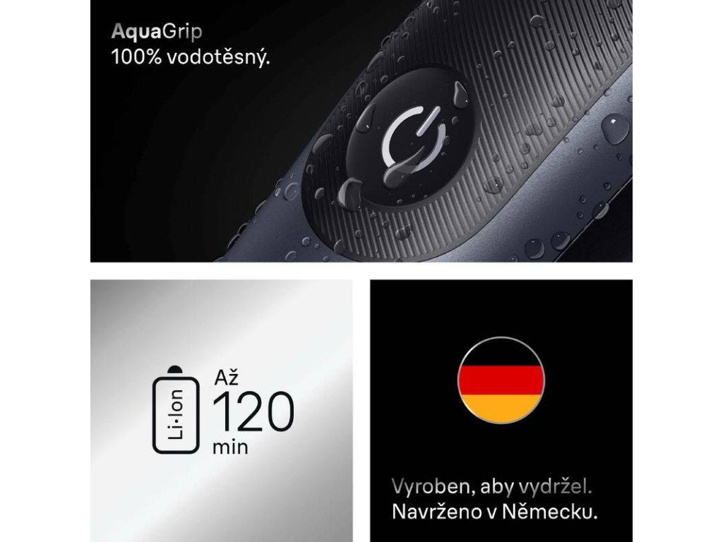 multifunkční zastřihovač • použití na vlasy, vousy, tělo, nos a uši • samoostřicí čepele ProBlade • akumulátor Li-Ion • výdrž 120 min. • 9 nástavců • vodotěsný • technologie AutoSense pro přizpůsobení výkonu • rukojeť AquaGrip